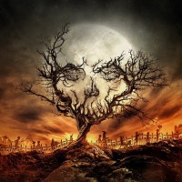 human skulls integrated into its structure as if they are part of the tree's branches or roots. The skulls have empty
