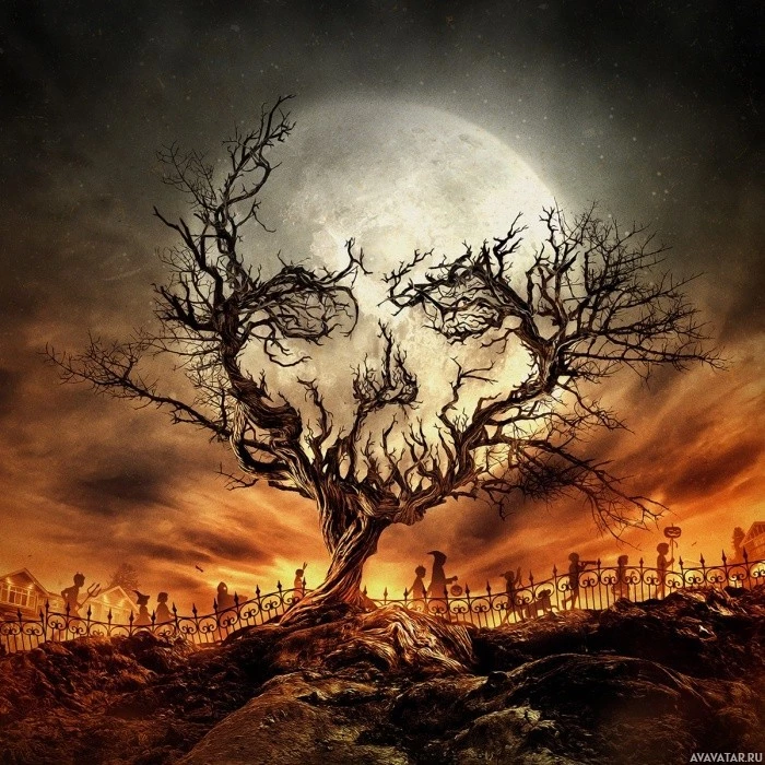 eye sockets and their teeth are visible, creating an eerie and macabre appearance. Behind the tree, there is