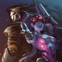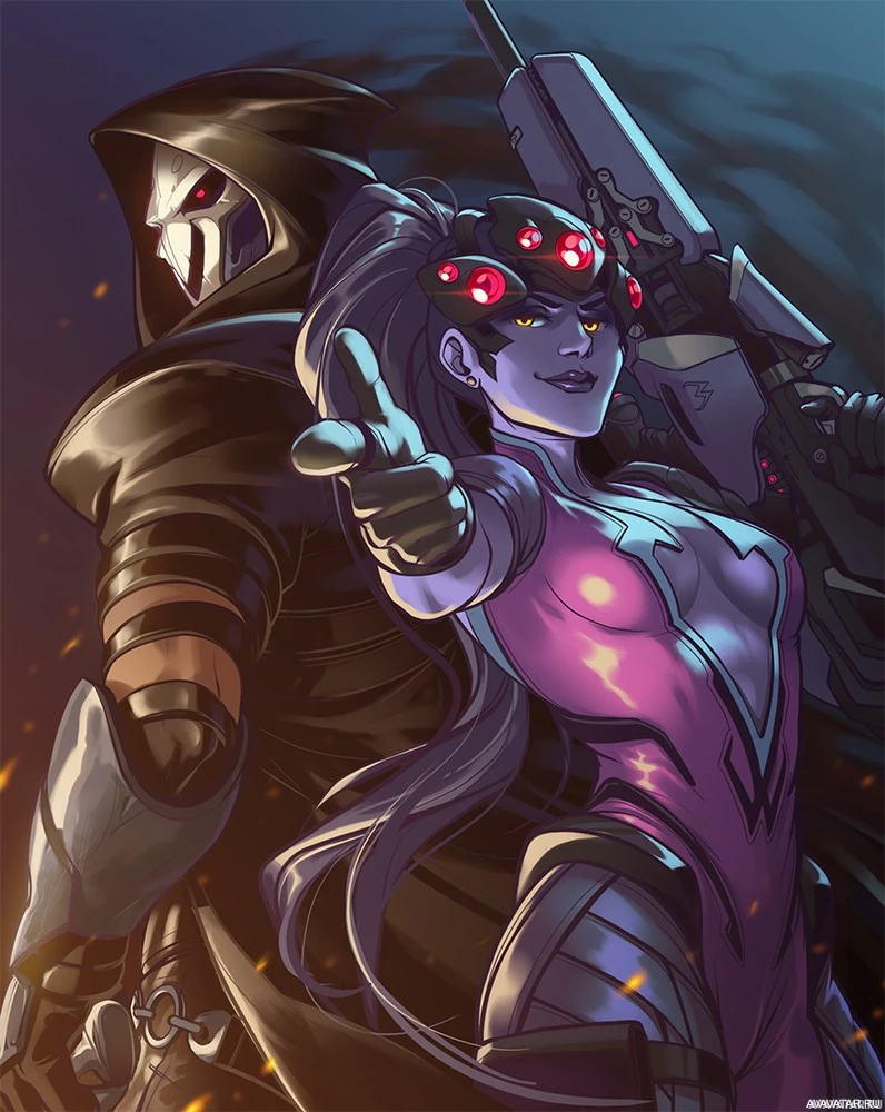 the video game Overwatch. On the left is Widowmaker, a highly skilled and deadly assassin known for her