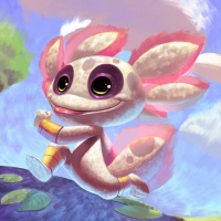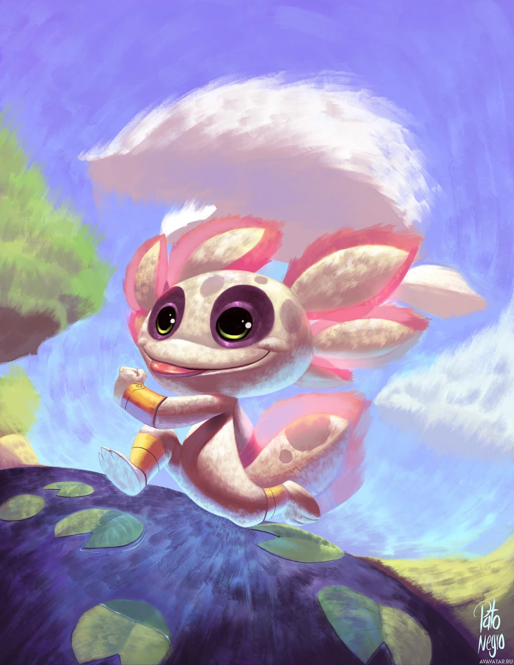 animated character that appears to be an axolotl. This creature is known for its unique features such as the large