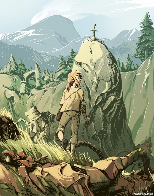verdant landscape characterized by greenery and rock formations. The setting suggests a peaceful