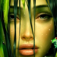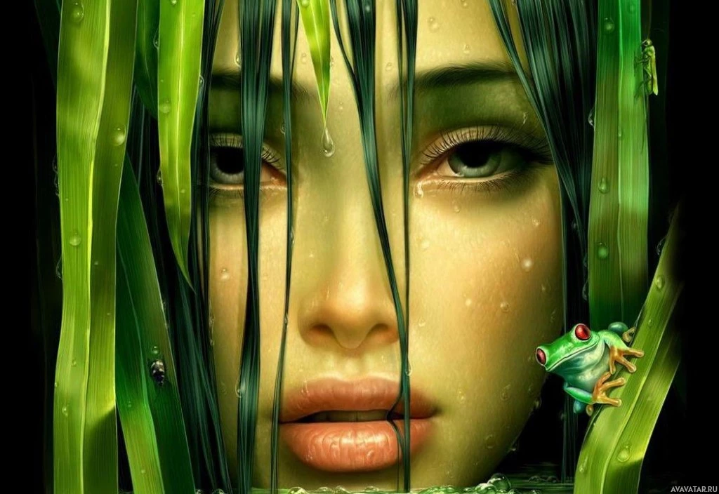 a small frog perched on her nose, adding a unique element to the image. The overall tone of the image is serene and has a fantastical quality due to the combination of