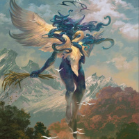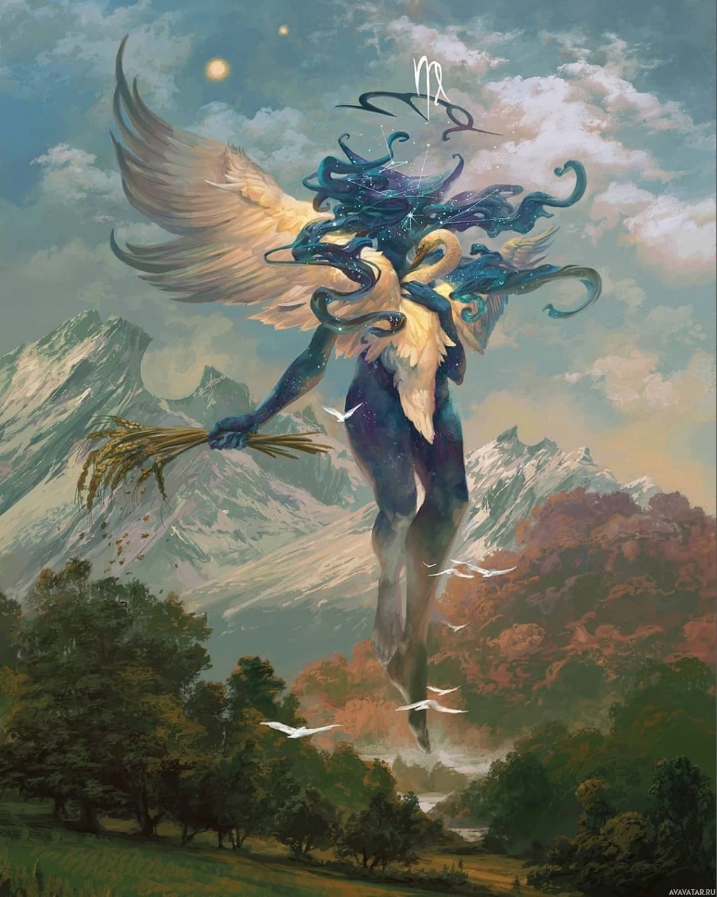 mythical being. The creature is holding what appears to be a bundle of wheat or grain in one hand and a sword in the other. This could symbolize agricultural fertility and warfare, respectively. The background shows a serene landscape with mountains, trees, and