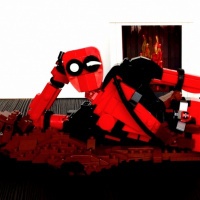 an Lego figure that resembles the Marvel Comics character Deadpool. He is depicted in