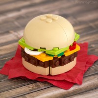 Lego model designed to look like a hamburger. The "bun" is made of yellow Legos, the "meat" in the middle is brown, and various toppings such as lettuce, tomato, cheese, and other colors are represented with