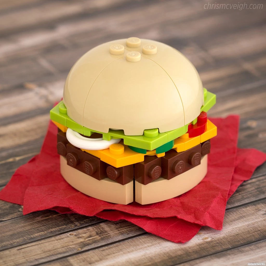 different types of Legos, including green, red, white, and black. It's a fun and playful representation of a hamburger using