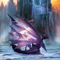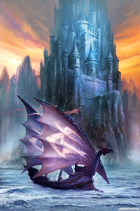 a fantasy scene with a castle perched on a cliff overlooking a body of water. There is