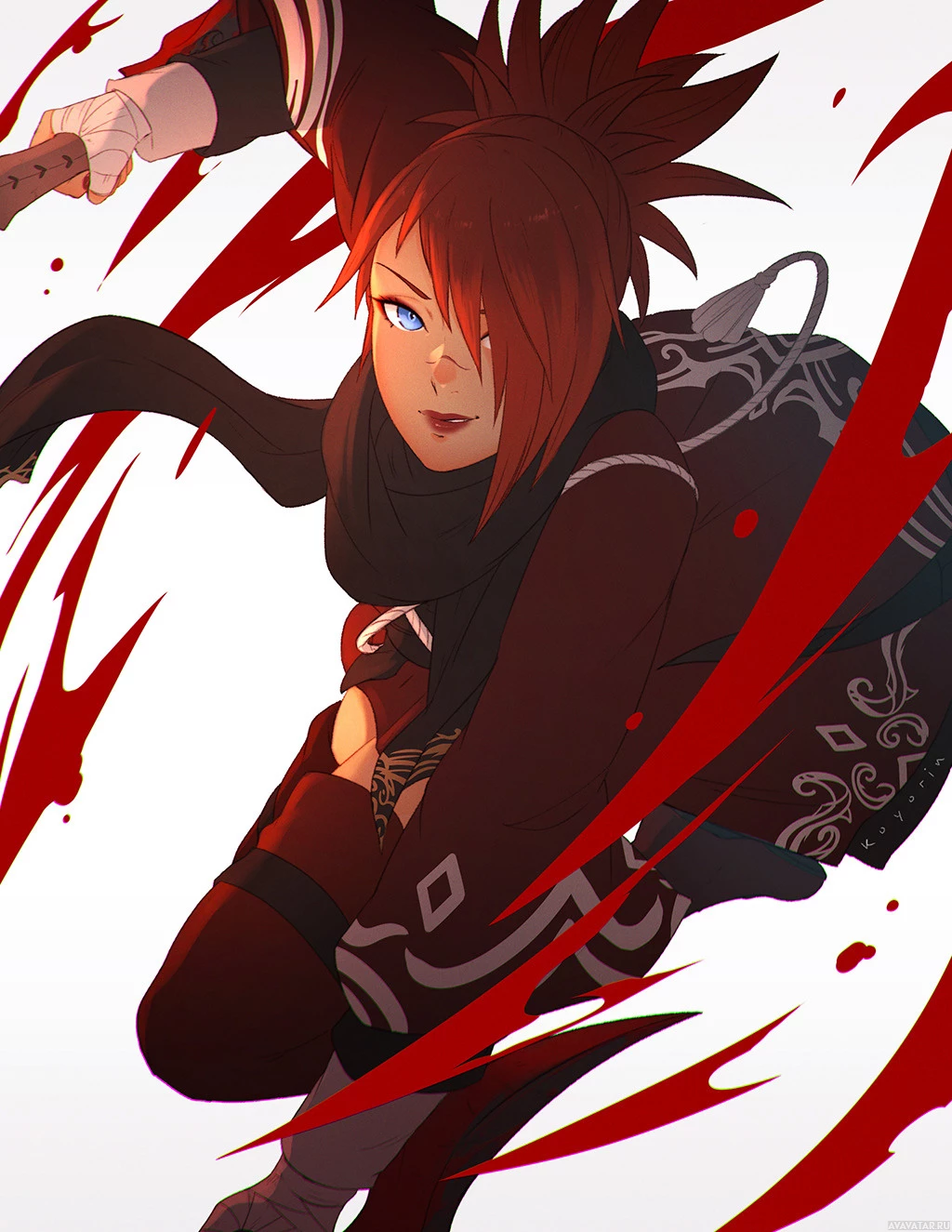 dynamic splashes of blood-like color, which could indicate that the character is engaging in violent or intense action.