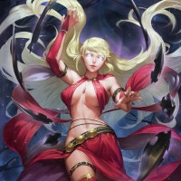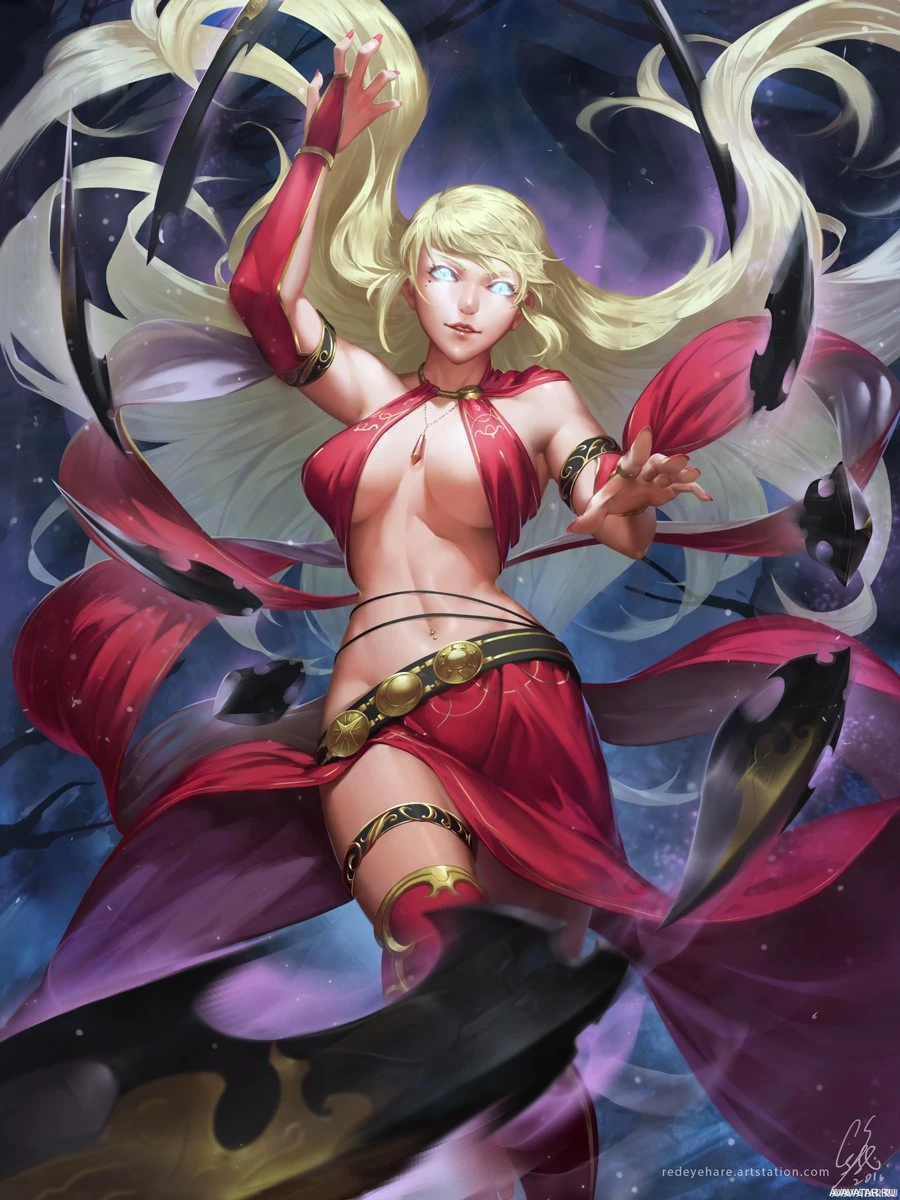 a dynamic pose, suggesting she might be in motion or performing some sort of magic or spell. Her outfit consists of a red bodice with wings on her back, indicating that she may have angelic or