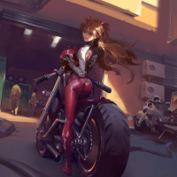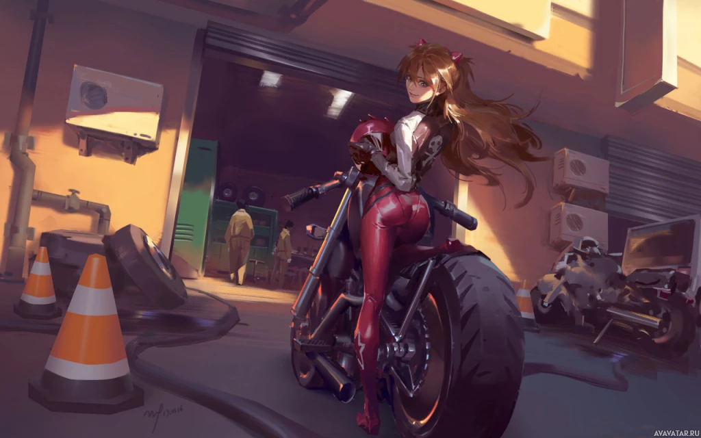 На картинке изображен анимированный персонаж Асука Лэнгли из популярного аниме-сериала «Neon Genesis Evangelion». Она изображена на мотоцикле. Обстановка выглядит как подземная или промышленная зона с большим оборудованием на заднем плане. Он выполнен в стиле, типичном для современной японской анимации с яркими цветами и подробным затенением.