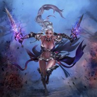 an action scene. Her attire suggests that she may be a warrior or a mage, given the armor and weapons she wields. The sword she holds in her right hand appears to be magically charged or imbued with some sort of energy, possibly from