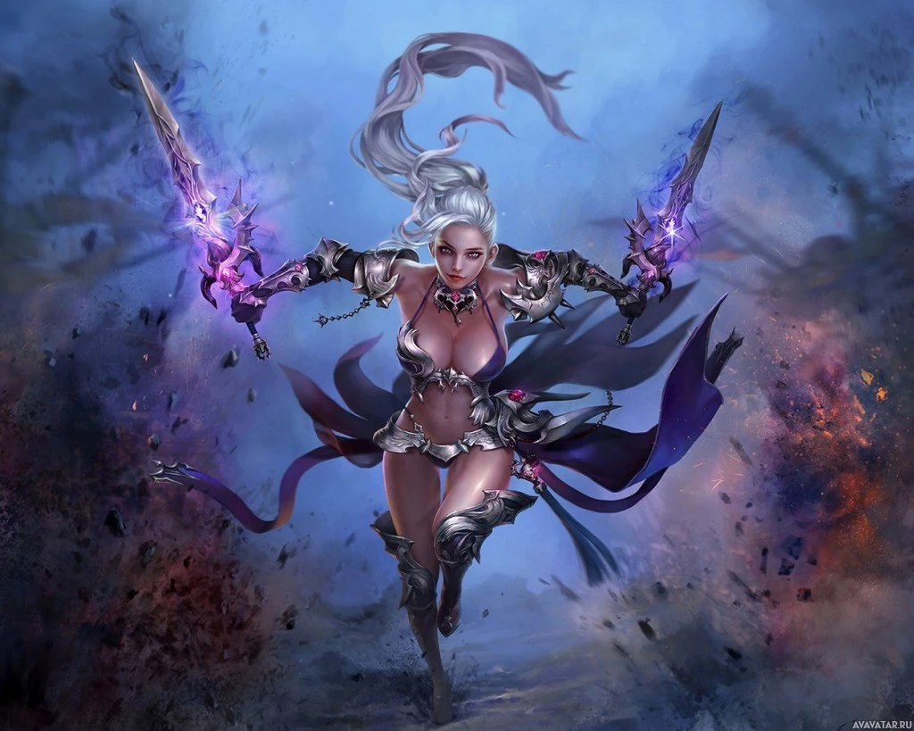 a female character from the fantasy genre. She is depicted with a strong and dynamic pose, as if she is in the middle of