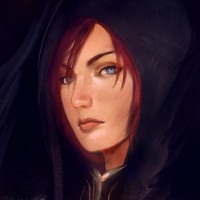 The image depicts a female character with red hair and wearing a cloak. She has a serious expression on her face, and there appears to be some sort of emblem or insignia on the left side of her chest area. The background is quite dark, which contrasts with her lighter skin tone, emphasizing her presence.