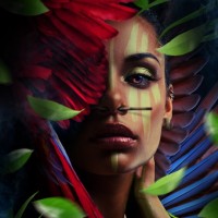 the vibrant colors in the foreground. There is a dramatic use of lighting that highlights certain parts of her face and features, creating a striking