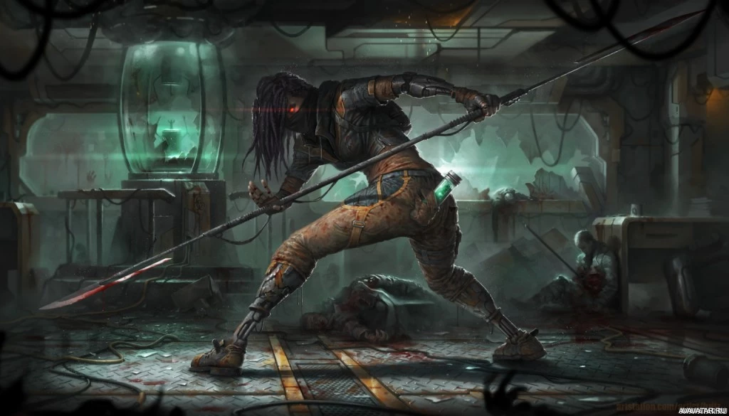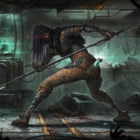 an action pose, holding what seem to be bladed weapons or tools. They are standing in a dark,