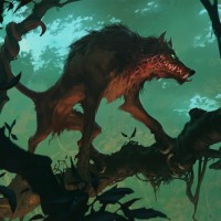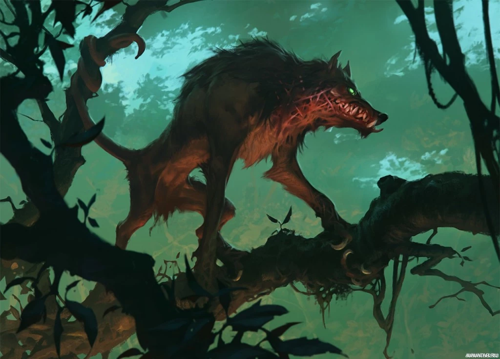 a dark forest, possibly a swamp given the misty and murky atmosphere. The werewolf is standing on its