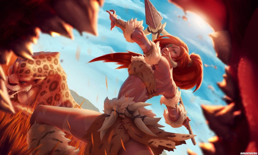 the midst of battle or action against what looks like a fierce creature. Another character with similar traits, possibly male, can be seen in the background, also engaging in combat. They are set against a backdrop that suggests an outdoor, perhaps volcanic, environment during daylight.
