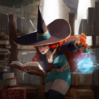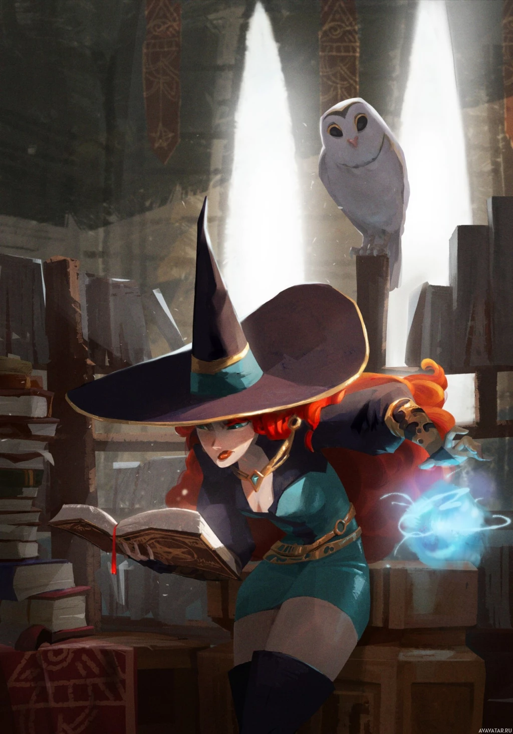 red hair, is wearing a black witch hat, and has a staff in her right hand. There's also an owl sitting on the table next to her, which adds to the fantasy theme of the picture. The setting appears to be a cozy library or