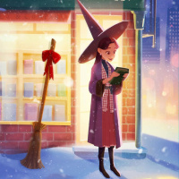 an animated show or film, who appears to be a witch. She is standing outside of a shop with the sign "BOOKS" displayed above the entrance. The character is wearing a witch's hat and has a wand in her hand. There are also snowflakes visible in the air, indicating that it might be winter or