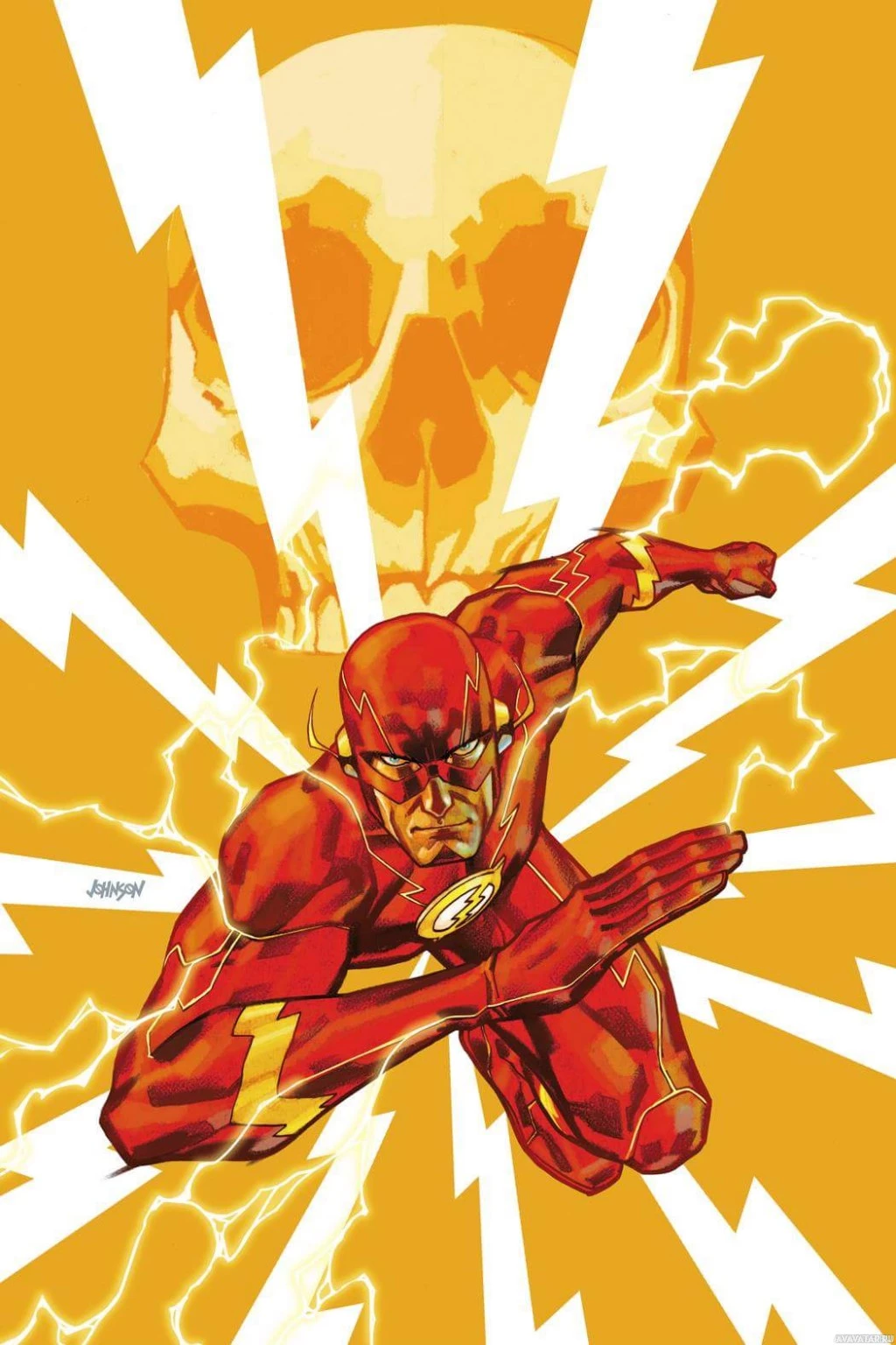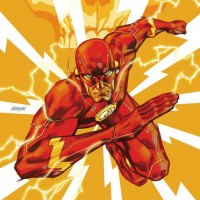 The image features a stylized depiction of the character known as "The Flash." He is shown in