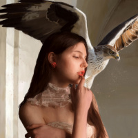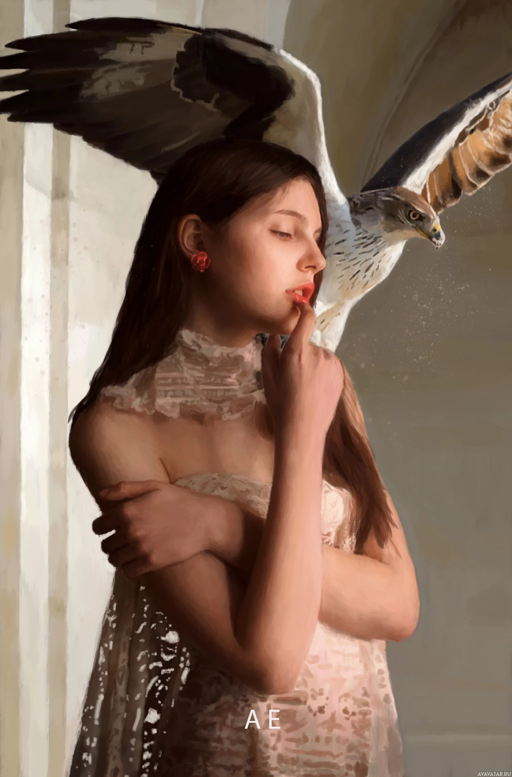 brunette girl with a hawk perched on her shoulder. She is dressed in what appears to be a vintage or classical style of clothing, possibly Victorian, given the lace and the silhouette of her dress. Her expression seems contemplative or thoughtful, and she has her hand near her mouth as if she's either deep in thought or perhaps whispering something to the bird. The artwork is detailed and evokes