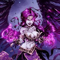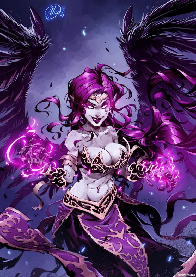 purple skin and dark feathers or wings that suggest she might have some kind of avian features. She is wearing what looks like a magical or mystical outfit with