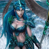 blue hair and eyes. She is dressed in aquatic-themed armor and attire, suggesting she may be a sea or