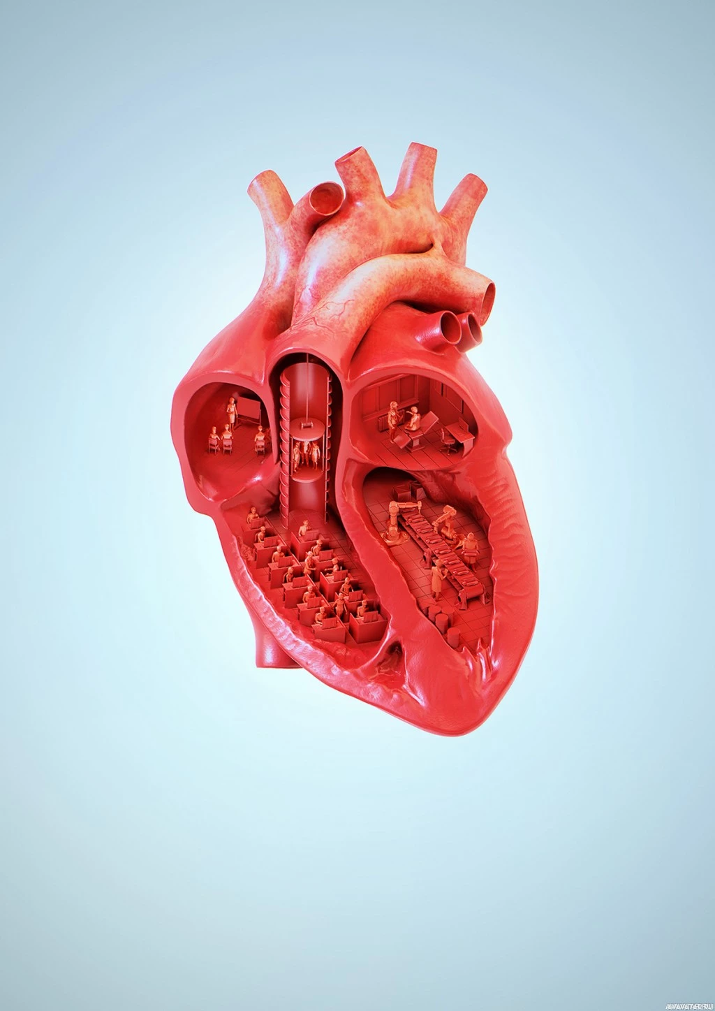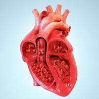The image shows a model of the human heart, which is typically used for educational purposes to explain how the organ functions. It includes the various chambers and valves of the heart, as well as the circulatory system.