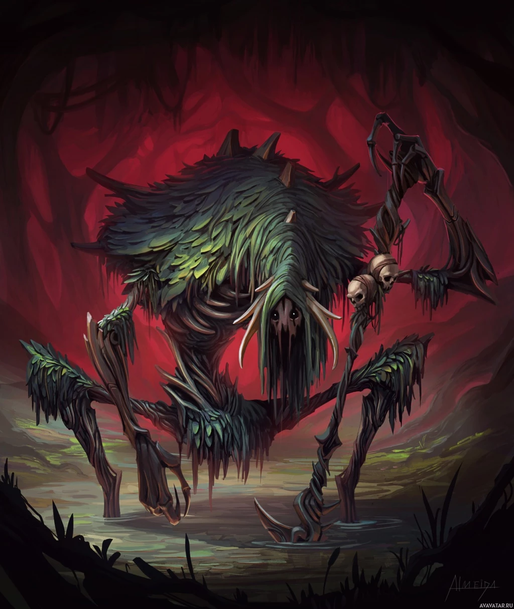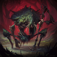 a humanoid form but is covered in green moss or foliage and has large, menacing eyes that seem to glow in the darkness. The creature's arms are extended forward, and its legs are positioned as if it were walking through a dark, foreboding environment, possibly a cave or