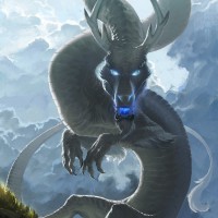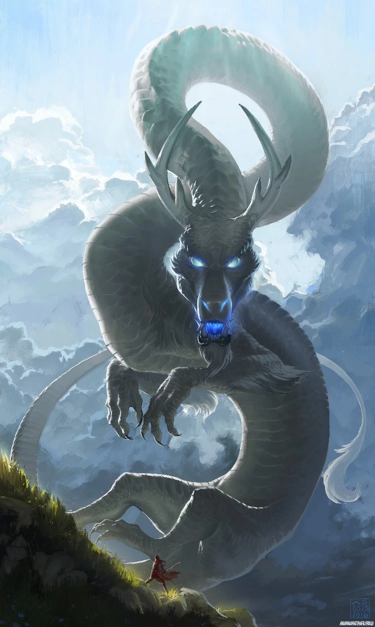 a fantastical scene with a dragon. The dragon is large, with scales and spikes that suggest