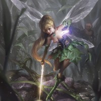 a female character who appears to be a fairy or fantasy creature. She has wings and is holding what seems to be a wand or staff with both hands, as if she's using it for magic or casting a spell. The character is surrounded by