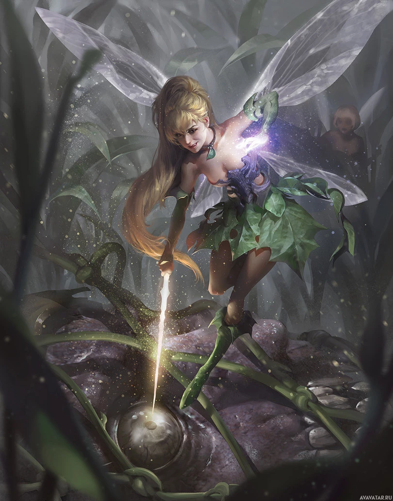 lush greenery and foliage, which suggests she might be in a forest or a magical garden setting. There are also some small insects hovering around her, adding to
