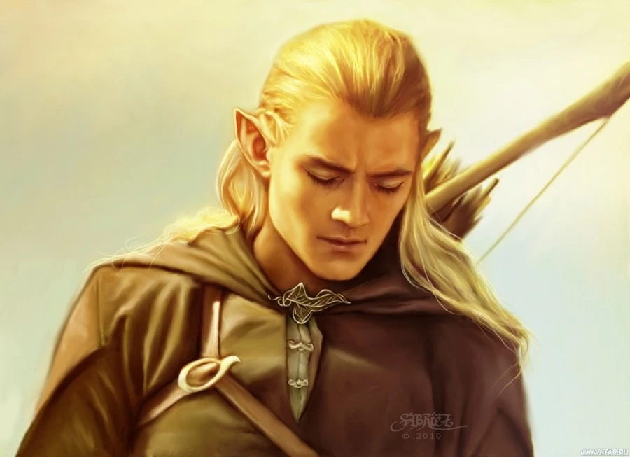pointed ears characteristic of his Elven race and a sword at his side, indicative of his role as a skilled warrior. He appears to be gazing into the distance with