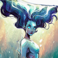 flowing hair that appears to be bluish in color and is set against a backdrop that includes bubbles and possibly seaweed or plants, suggesting she's underwater. The style of the artwork is whimsical with