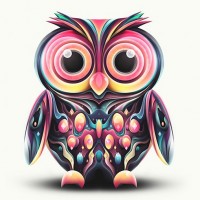 vibrant colors on its body and wings, with shades of pink, purple, blue, and green creating a psychedelic pattern that gives it an interesting and modern appearance. The eyes are large and expressive, adding to