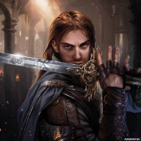 a male character in what appears to be fantasy or historical costume, holding a sword. He has