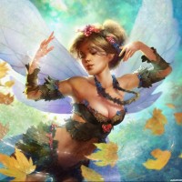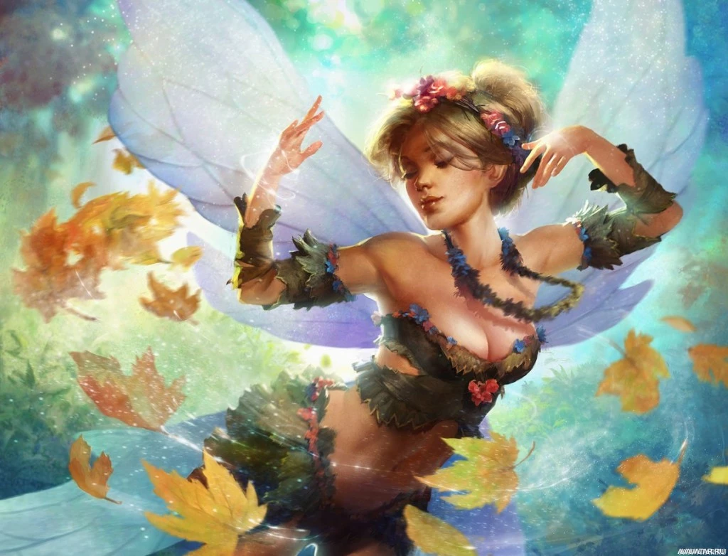 a magical forest during the fall season, given the presence of autumnal foliage on the ground and in the background. The character is wearing a dress with natural elements, like what looks like leaves, which complements her woodland theme. The overall style of the image suggests it could be from