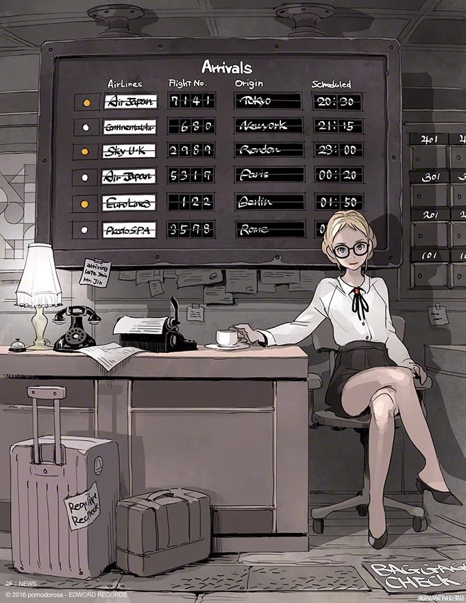an illustrated scene with a woman sitting at a desk. She appears to be dressed in