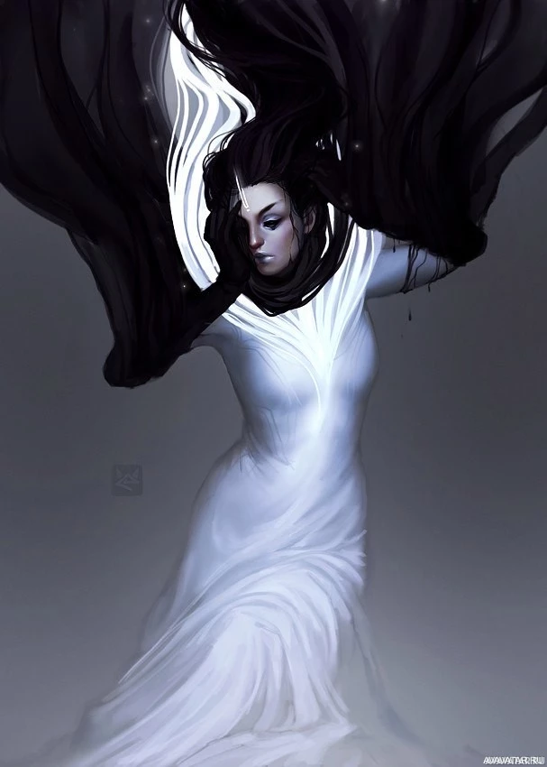 a white garment, possibly a dress or top, which contrasts with her darker, more earth-toned hair. The artwork has a surreal and ethereal quality to it, suggesting she may be a character from