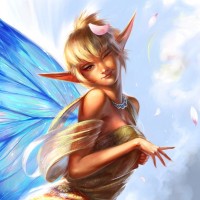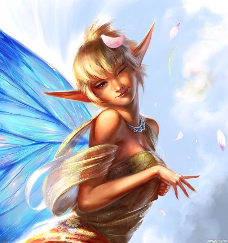 a young woman with pointed ears and wings that suggest she might be a fairy or similar magical creature. She has