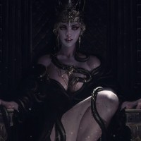 a soft glow in the background. Her armor includes elements like snakes, suggesting a fantasy or mythical theme.