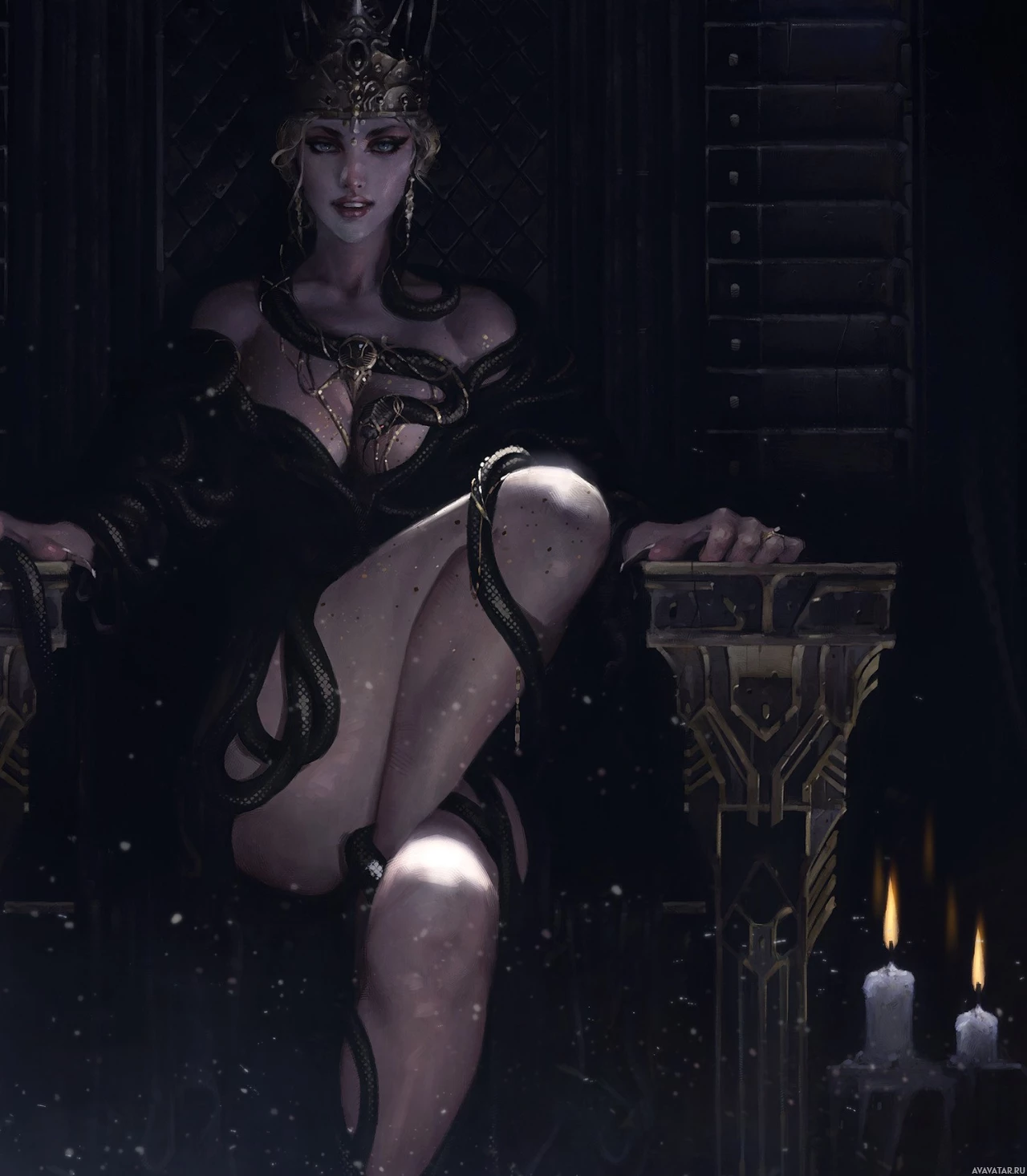 intricate designs and wearing a crown that suggests royalty or power. Her expression is intense, looking directly at the viewer. The setting appears to be a throne room with candles casting