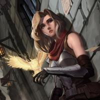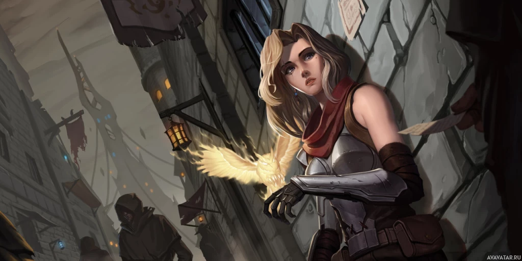 blonde hair, wearing a hood and a brown cloak. She is holding what looks like a crossbow or a similar type of bow in her right hand. Behind her, there's