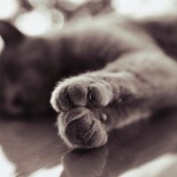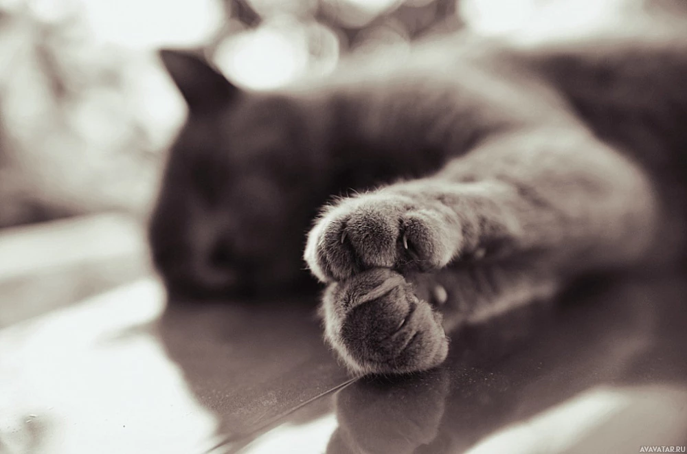 a reflective surface. The cat is positioned in such a way that its paws are extended forward and its head is resting comfortably, suggesting the animal might be relaxed or sleeping. The photograph has a monochrome style, providing it with an artistic quality.