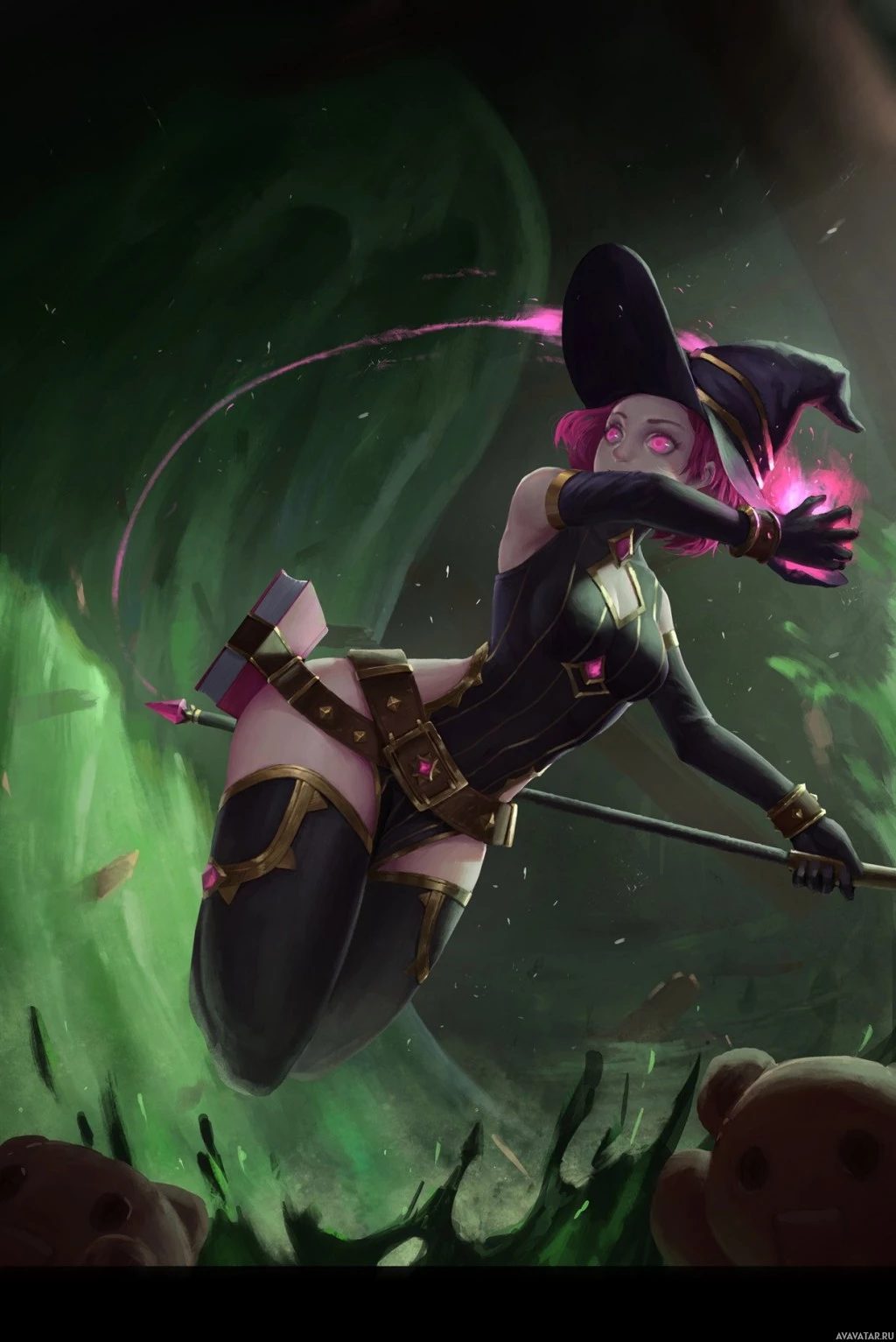 Картинка показывает вымышленного персонажа ведьмы. На ней черный наряд с розовыми акцентами и на голове колдунья. Она накладывает заклинание, на что указывает палочка в руке и магическая энергия, текущая вокруг нее. Фон показывает темную, возможно зловещую среду, которая контрастирует с мистическим одеянием персонажа.