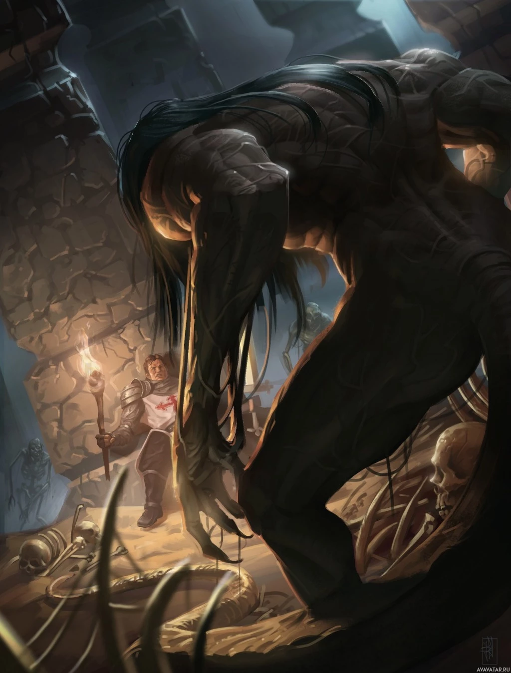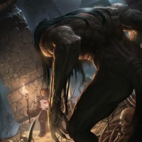 lit room or cave with rough stone walls and a torch providing light. The atmosphere evokes