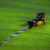 surrounding water is greenish in color, suggesting that it may contain high levels of algae or nutrients which have contributed to the growth of the algae. The focus is on the duck, with