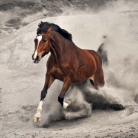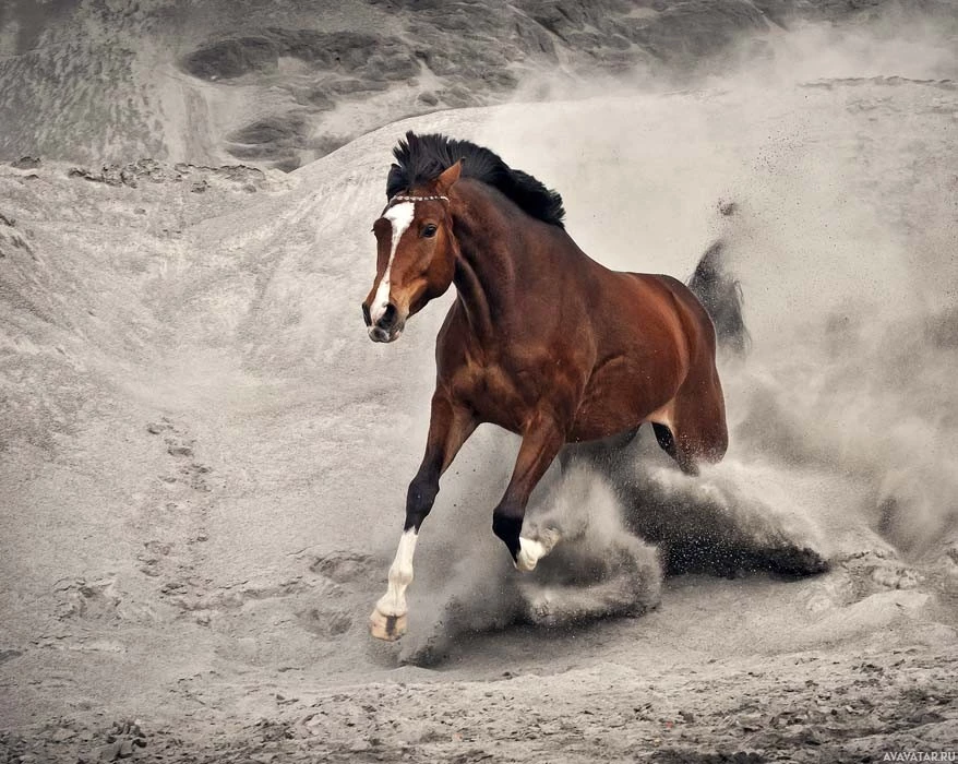 На картинке изображена лошадь в середине галопа на песчаной поверхности. Лошадь имеет отличительный белый огонь на лице и носит уздечку, что указывает на то, что она может использоваться для верховой езды или тренировок. Пыль, поднимаемая копытами лошади, предполагает сухую, засушливую среду. Эта сцена отражает суть движения и скорости, обычно связанной с лошадьми.