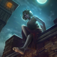 The image features a character from the video game "The Witcher 3: Wild Hunt." This character is portrayed with a fantasy theme, sitting on the roof of a building at night. There's a moon in the sky, which adds to the atmospheric and nocturnal setting. The artwork is detailed and captures the essence of the game's aesthetic, which combines elements of fantasy with realistic environments.