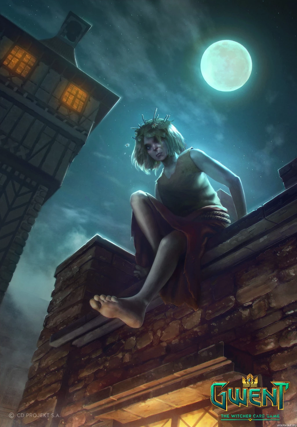 На картинке изображен персонаж из видеоигры «Ведьмак 3: Дикая Охота». Этот персонаж изображается с фантастической темой, сидя на крыше здания ночью. В небе есть луна, которая добавляет атмосферы и ночной обстановки. Произведение детализировано и отражает суть эстетики игры, которая сочетает в себе элементы фэнтези с реалистичной средой.
